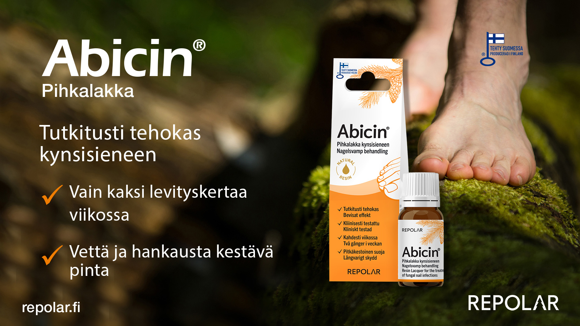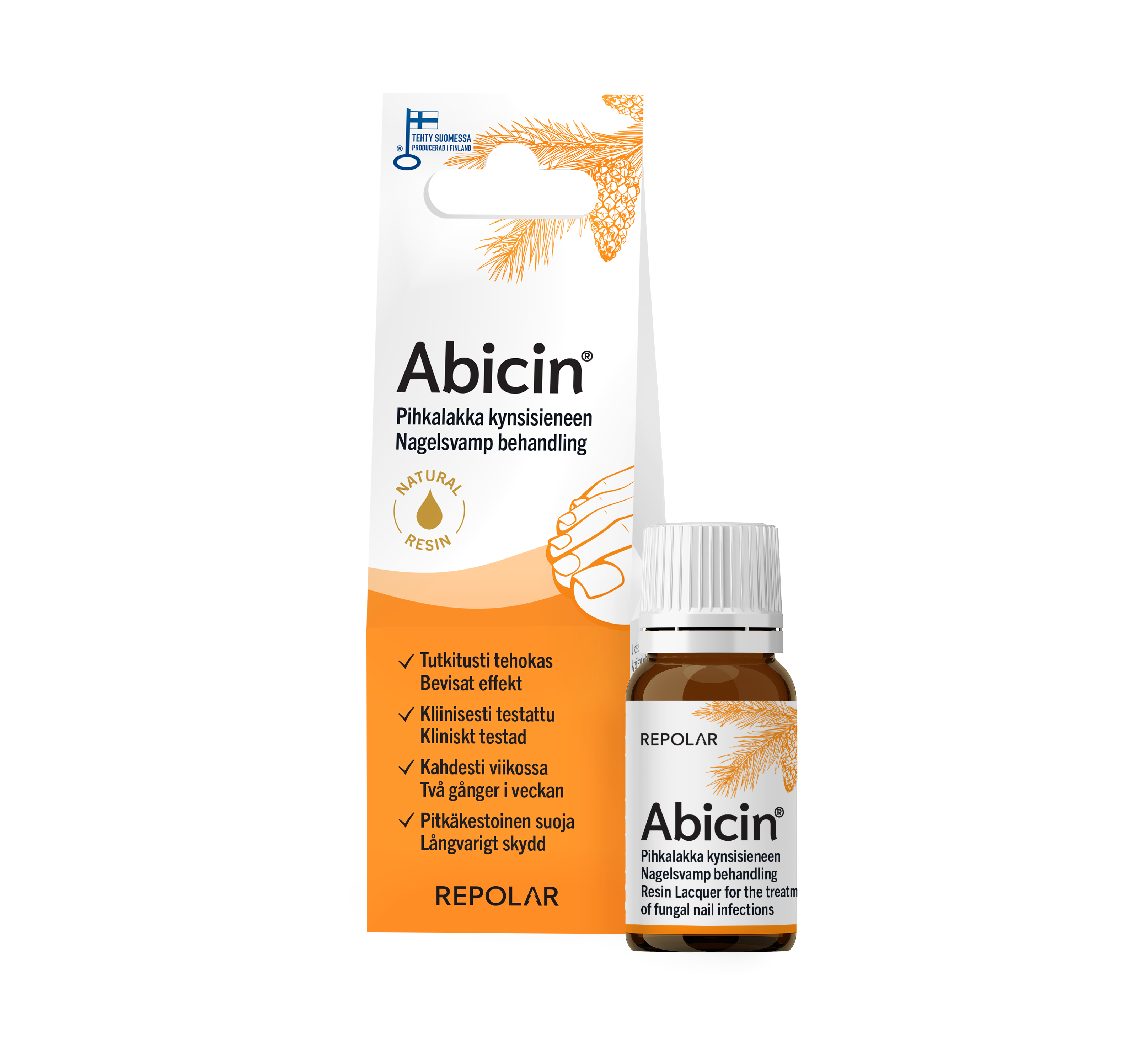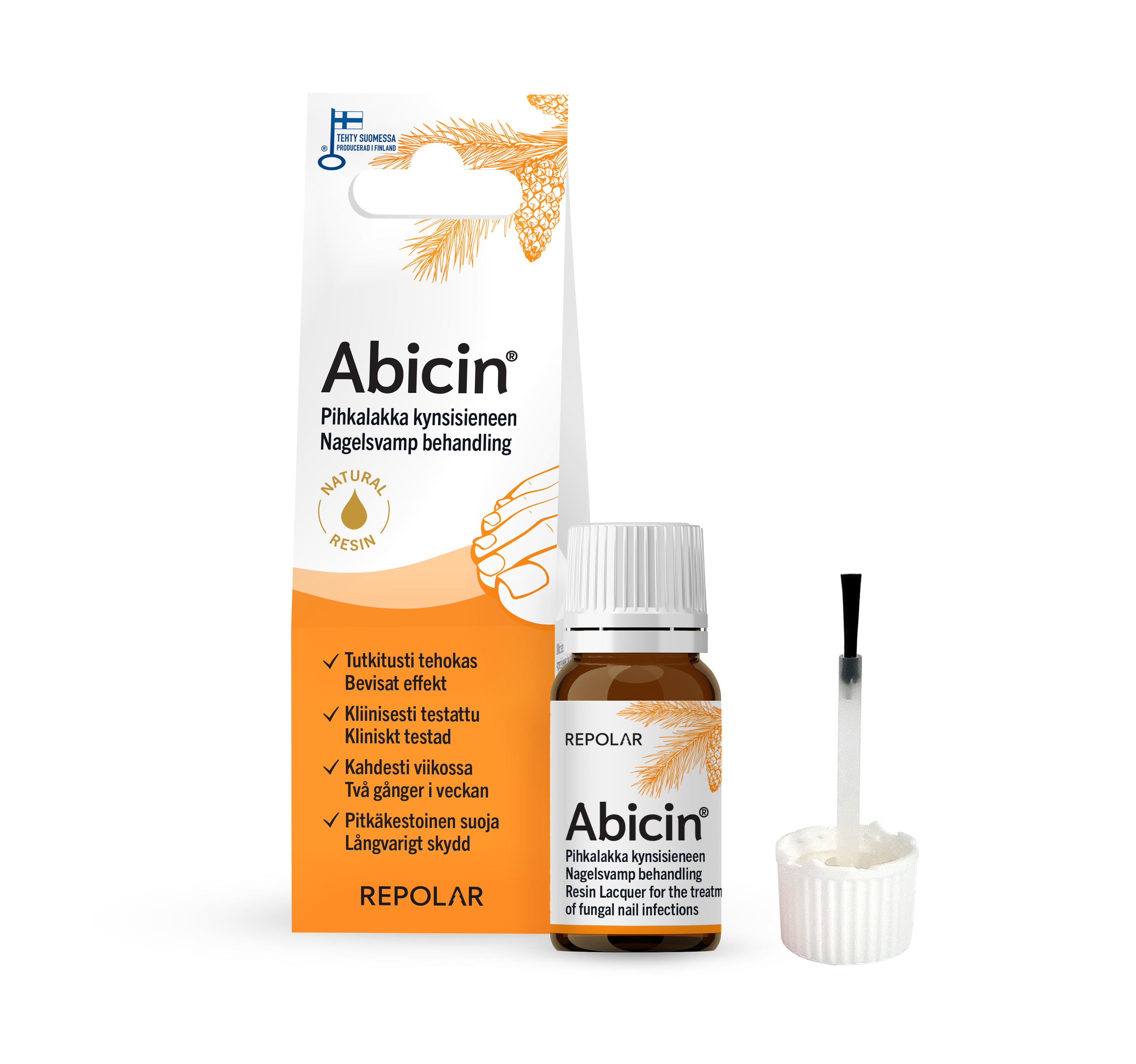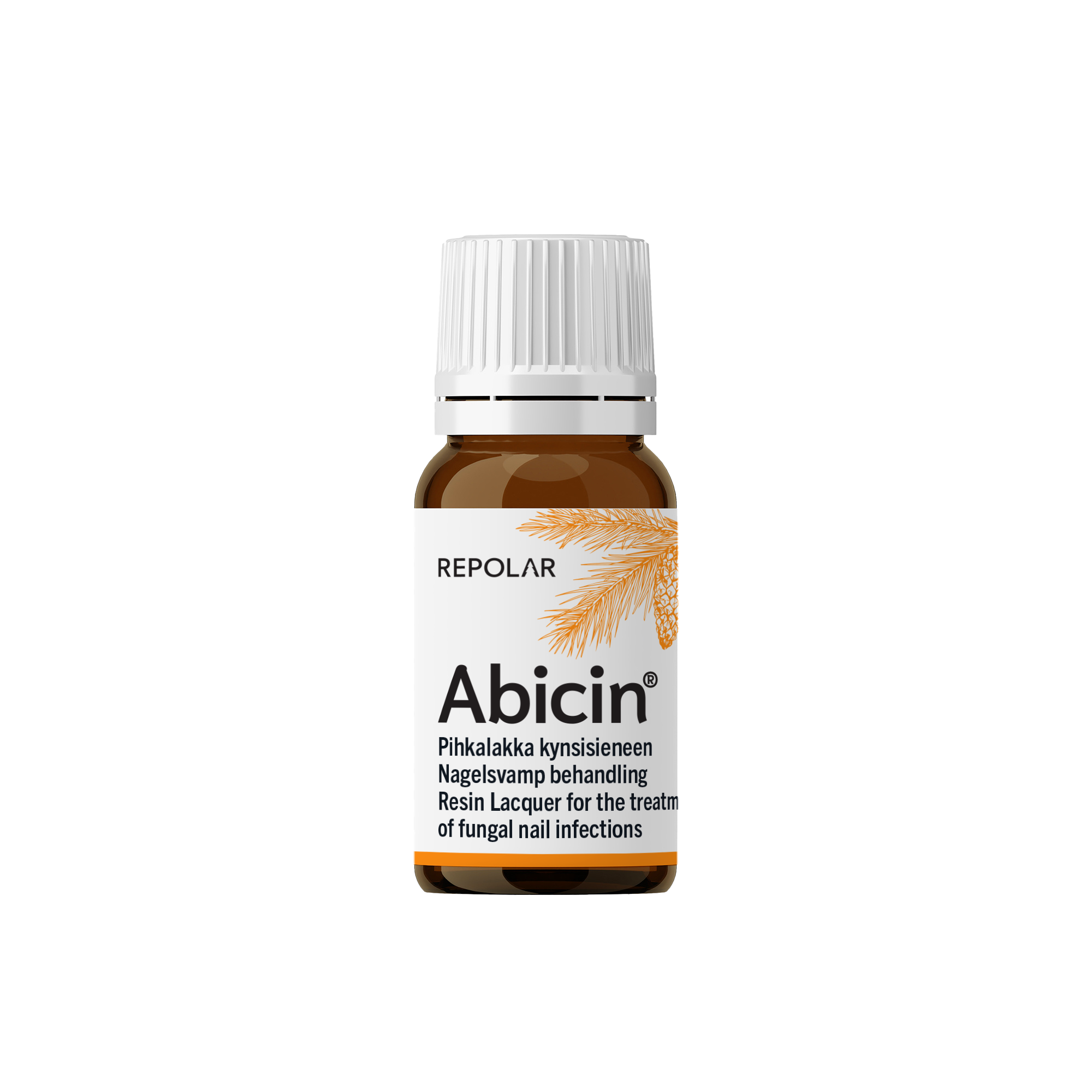 Vajadusel karestada küüne pind viiliga, enne lakkimist pesta ja kuivatada. Kandke korgi küljes oleva pintsli abil õhuke kiht lakki kogu kahjustatud küünepinnale, -servadele ja serva alla ja laske sellel kuivada. Jätkake ravi Abicin®-iga kaks korda nädalas, kuni kahjustatud küüs on asendunud uue terve küünega.